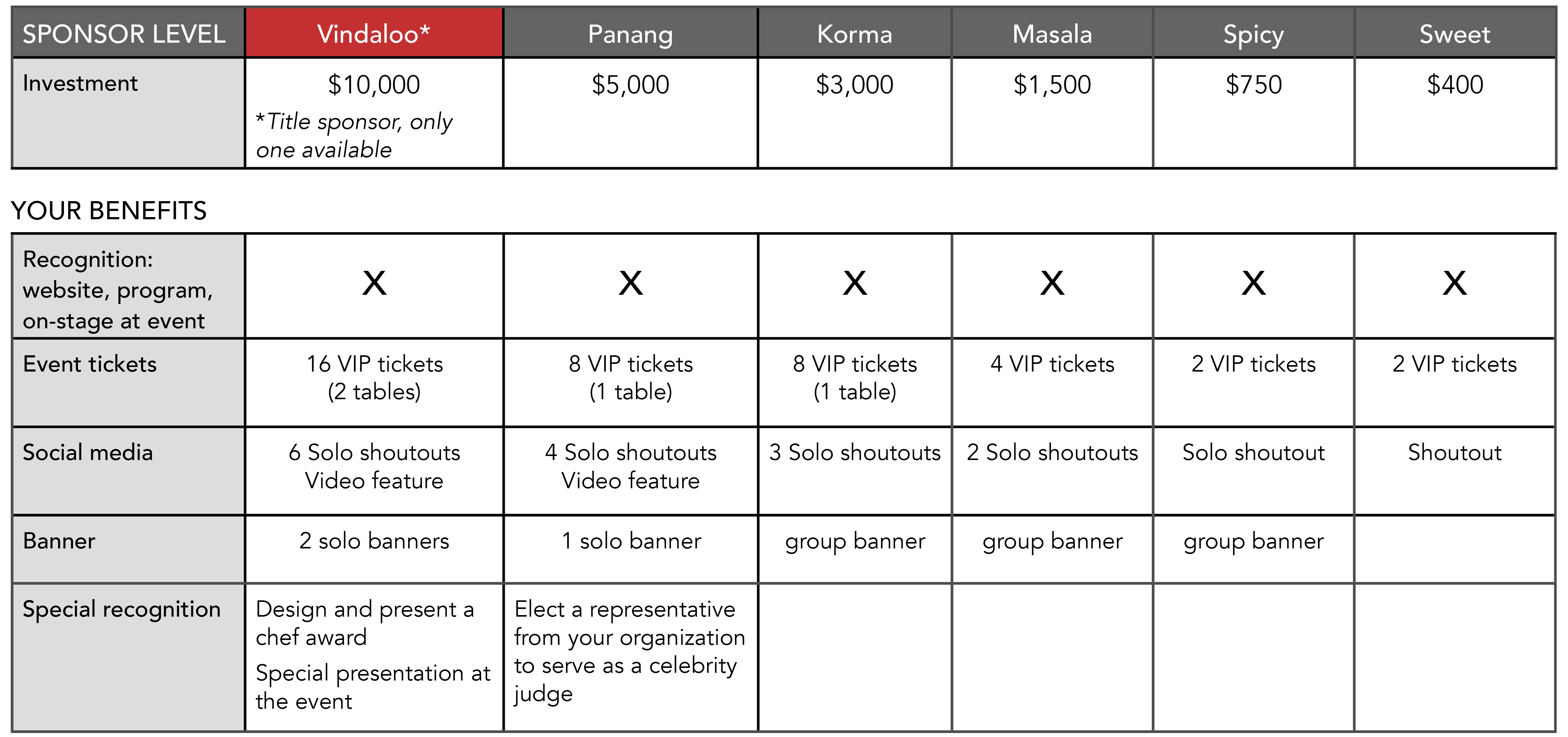 Tickets will go on sale October 1st, and they go FAST - so stay tuned. Sponsorships are available now and come with VIP tickets which include early arrival for special VIP tastes and a signature Curry Clash gift.